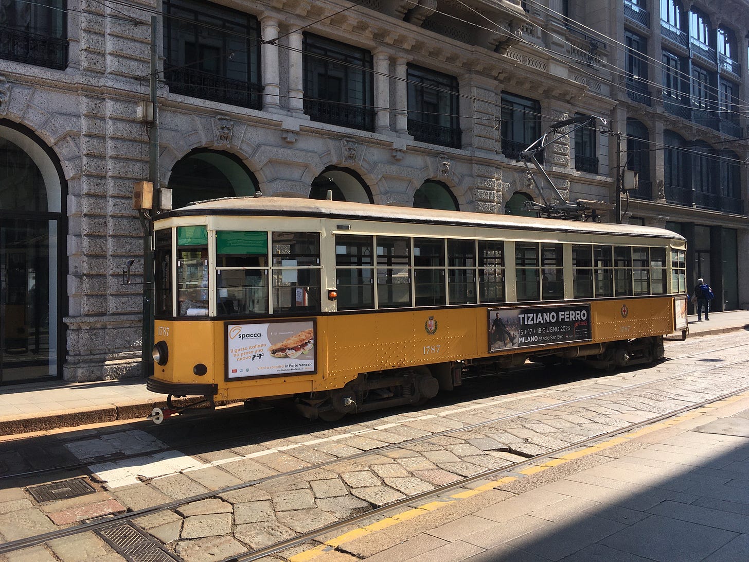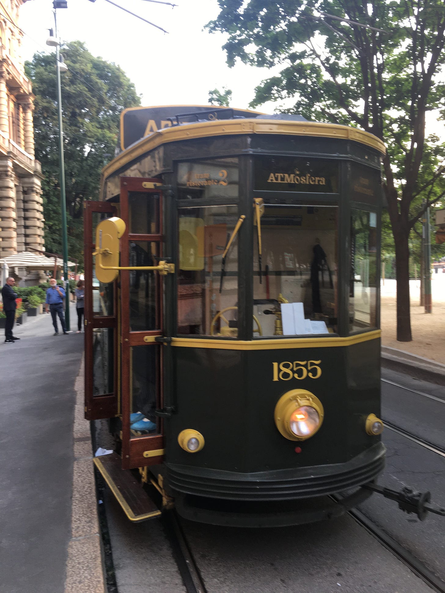 I’ll leave you with a small marvel I stumbled upon. The name of Milan’s transit operator, which was “Edison” until 1917, is now ATM. (When I saw this on a metro entrance, I thought they were talking about a cash distributor—but of course, in Italy, that’s a “Bancomat.”) Strolling near the Parco Sempione in the evening, I saw a vintage tram with a green livery and the word ATMosfera painted on the side. I followed it to a stop, where I saw well-dressed couples boarding, and sitting down at tables covered with white tablecloths inside. It turns out the ATMosfera is a dinner-tram: in the evenings, and on Sundays, guests are taken for a leisurely ride around the city, while being served a multi-course meal.