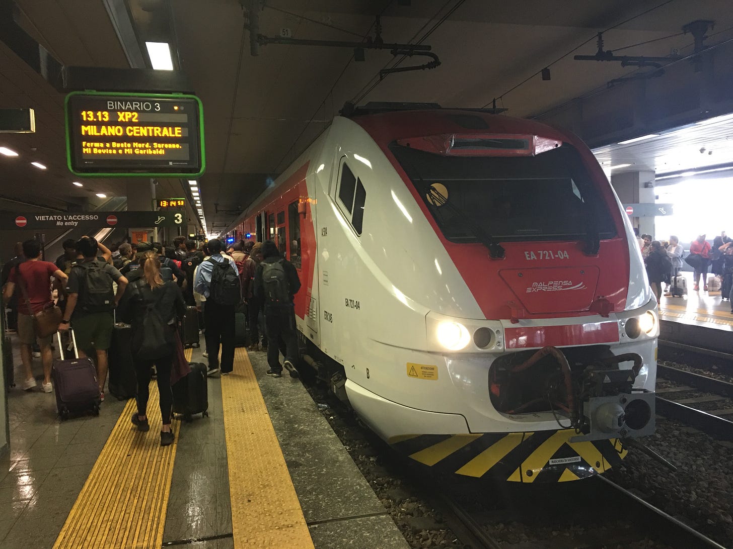 To leave Canada, I took the metro and a bus ride to Montreal’s airport; most of the trip was through rush hour traffic on the highway. (A taxi would have cost $60 Canadian, or $45 US.) Arriving in Milan after an overnight flight, I looked for, and found, a train right in the terminal: the Malpensa Express. I bought a ticket for €13, about $14 US, and rode an escalator down to the platform. Malpensa Airport is over 40 km from the city center, and the train—which was direct, but not high-speed—got me to Milano Centrale in 51 minutes.