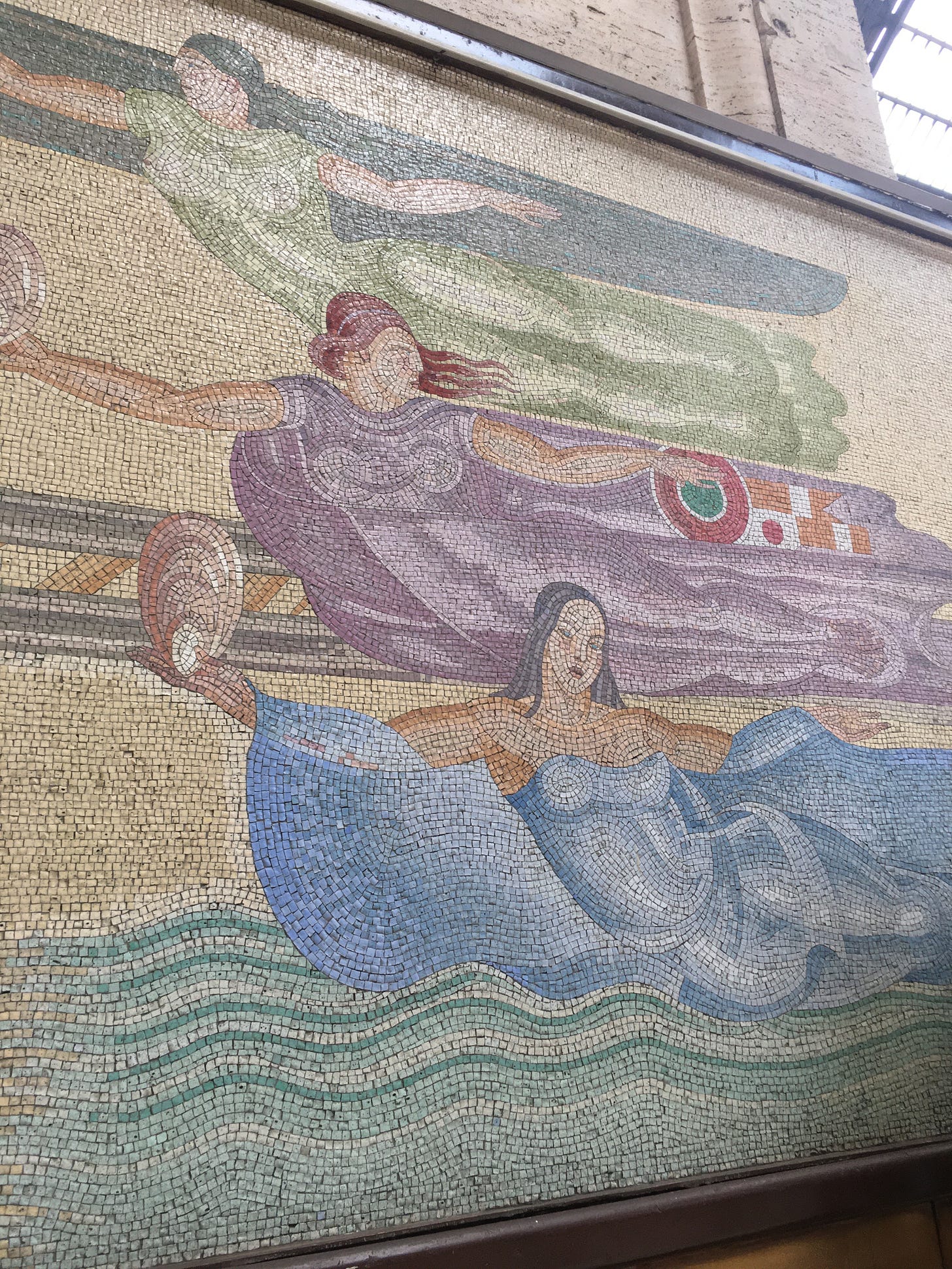 This is one of Italy’s great railway stations, a soaring Mussolini-era concoction of stone and marble, festooned with winged horses and modernist tilework of nymphs on streamlined trains. A little overwhelming, in fact, especially after a sleepless night in economy, so I wheeled my suitcase to my hotel, about 15 minutes away, and had a nap.
