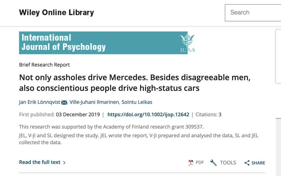 When I posted this on social media, I got a lot of NSS (No Shit, Sherlock) responses, and some ironizing about social scientists squandering research funds to confirm the obvious. Many European readers objected that, where they lived, Mercedes, BMWs, and Audis weren’t considered high status cars. (The mind boggles—in Germany, the fatherland of the luxury driver, is every driver then an Arschloch?) Amusingly, at least to me, there is a more recent study out of Finland entitled: “Not only assholes drive Mercedes.” The subtext being: Joo, you’re right though, most of them are a-holes.