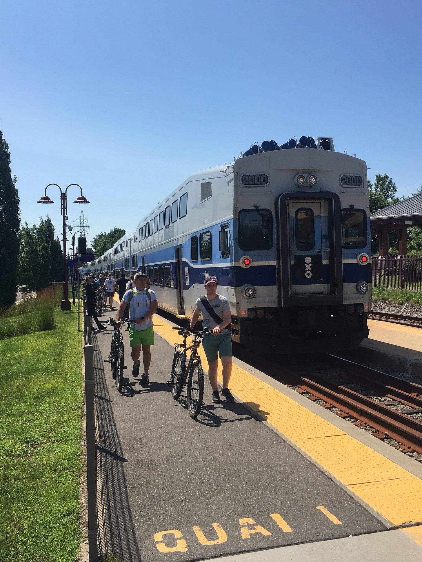 The trip started on the platform of the Rosemont station of the métro’s Orange Line. (You can wheel bikes onto the front car of Montreal métro trains for free.) Then a straight shot north to the De la Concorde station, which got us to Exo, as the commuter-rail network in the Montreal area is known. I bought a ticket at a machine on the outdoor platform ($6.80; Desmond, who is 11, still rides free), and then we hoisted our bikes up onto the train and attached them with bungee cords so they wouldn’t get tossed around during the trip. Exo serves the suburbs of Montreal with big, double-decker diesel trains, which aren’t wheelchair accessible, and seem radically overbuilt for the job. (Like Via Rail, they share many stretches of tracks with freight trains; if they had their own tracks, lighter electric trains would be easy to run.)