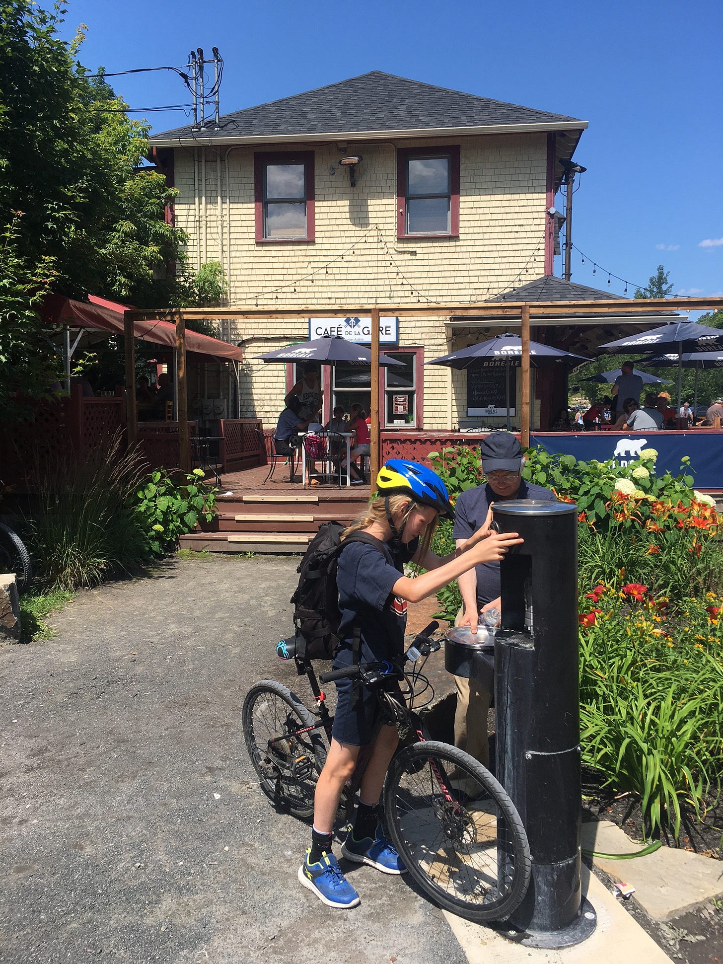 The following day was a Monday, and the trail back was far less crowded; in fact, for long stretches, we were entirely alone. I coaxed Dez along with promises of Gatorade and snacks; we finally decided to stop for a full lunch, of wraps, potato salad, and homemade lemonade, on the terrace of the Café de la Gare at Kilometer 25, in the former station of Ste-Adèle.